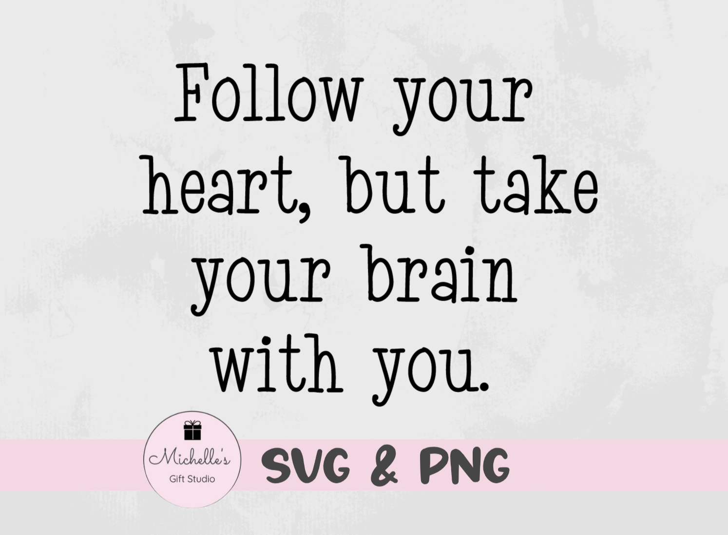 Follow Your Heart But Take Your Brain With You is a digital cutting file that can be used with Cricut or Cameo cutting machines. Please be sure your cutting machine & software are compatible with one of the file types listed below BEFORE purchasing.