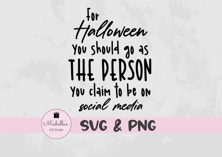 For Halloween You Should Go as the Person You Claim to be on Social Media is a digital cutting file that can be used with Cricut or Cameo cutting machines. Please be sure your cutting machine & software are compatible with one of the file types listed below BEFORE purchasing.