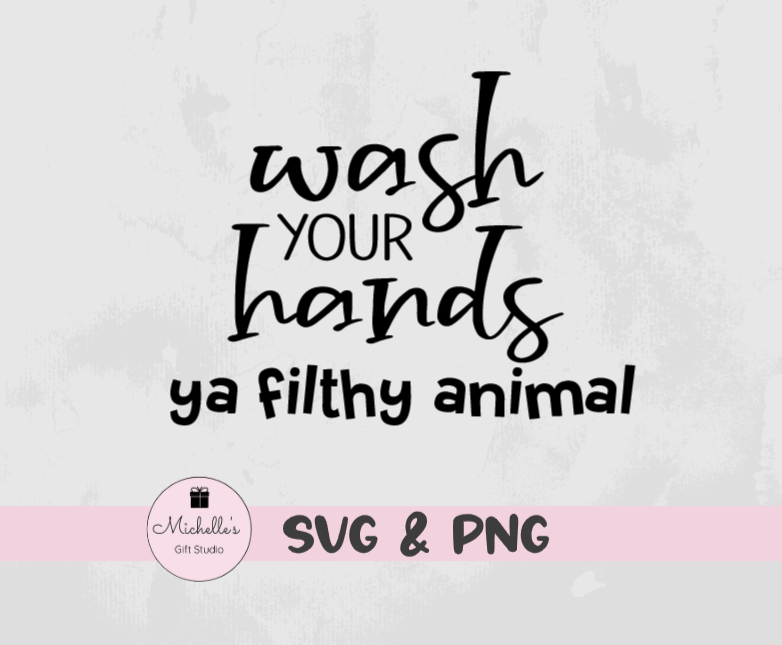 Wash Your Hands Ya Filthy Animal is a digital cutting file that can be used with Cricut or Cameo cutting machines. Please be sure your cutting machine & software are compatible with one of the file types listed below BEFORE purchasing.